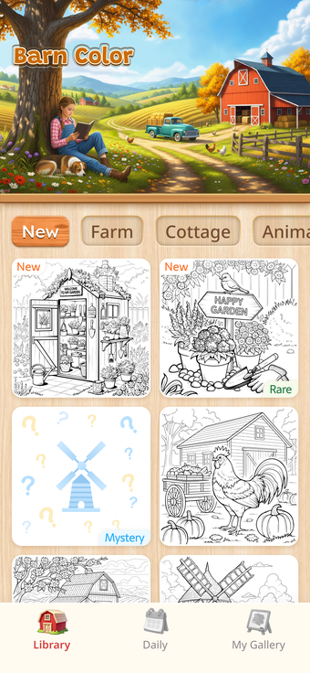 Barn Color: Farm Painting är en gratis färgläggningsapp för iPhone som erbjuder en avkopplande och kreativ upplevelse för vuxna. Denna app tar användarna till en lugn lantlig värld, där de kan färglägga vackra scener av gårdsliv, inklusive gyllene fält, vintage bondgårdar och djur som kor och får. Med säsongsbetonade motiv som förändras över tid, ger appen en känsla av tidens gång och naturens skönhet.